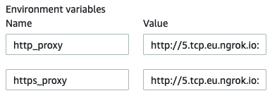 insecureSsltoTrue. The following is an example of my updating a project, notice theinsecureSsl=Trueat the end (this is the only thing you need to change from the gathered configuration).- Moreover, add also the env variables http_proxy and https_proxy pointing to your tcp ngrok like: