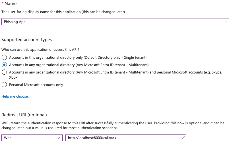 - Application Registration in Azure AD: The attacker then registers a Multi-Tenant Application in their Azure AD Tenant, naming it after the target company to appear legitimate. They configure the application's Redirect URL to point to the subdomain hosting the malicious application.