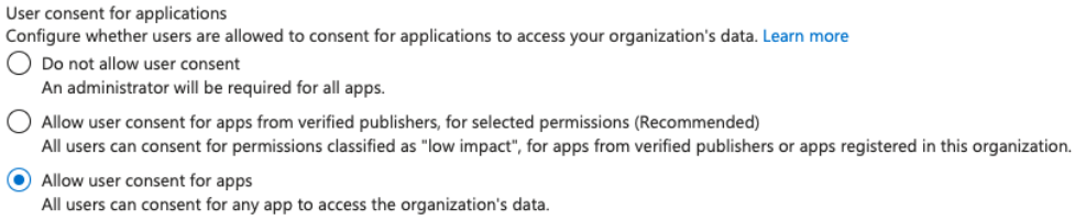 permissionGrantPoliciesAssignedyou can find:ManagePermissionGrantsForSelf.microsoft-user-default-legacythen users can to accept every application. - Users can consent to apps from verified publishers or your organization, but only for permissions you select: If inside