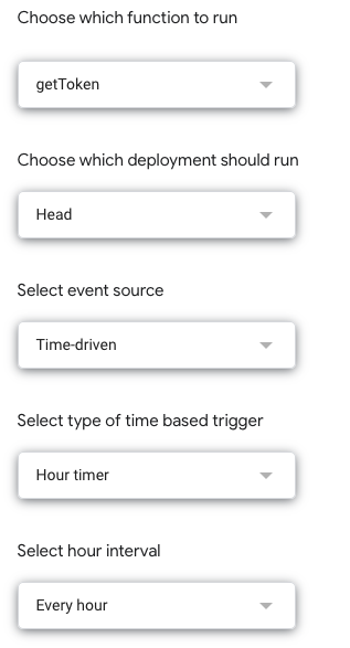 Once the App is read, click on ⏰ Triggers to create a trigger. As function ro tun choose getToken, runs at deployment Head, in event source select From spreadsheet and event type select On open or On edit (according to your needs) and save.